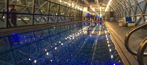 The indoor pool, located above the terminal area at Qatar Airways' Al Mourjan Business Lounge, Hamad International Airport. Photo by wandering travel4seniors editor.