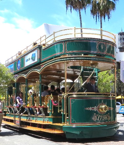 Shoppers enjoy the double-decker, open-air ride down the main street of the famed Farmers Market at The Grove. www.thegrovela.com
