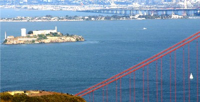 Your travel4seniors.com editor on the road. Scene from the Golden Gate Bridge in San Francisco Bay. For visitor info, go to www.nps.gov/alca