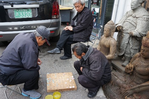 Your travel4seniors.com editor captures this bucolic scene on the streets of the South Korean capital city. The intensity of the local chess-type of board game seems to attract both live and stone kibitzers.