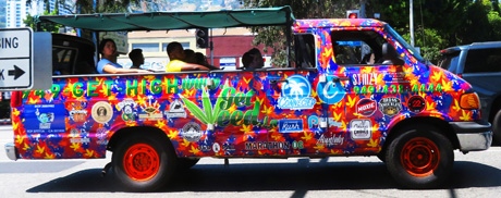 The brightly-painted bus takes curious tourists along the streets of Tinseltown. Looks like a HIGHway stop for the bus riders will be at one of the now-legal Hollywood Boulevard pot shops.